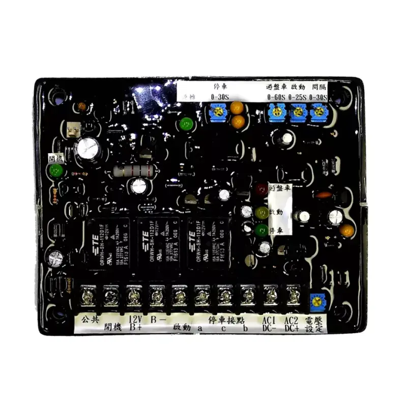■功能1. 直流啟動控制板 DC12/24V2. 預熱∕延遲啟動 18秒可調3. 啟動 18秒可調4. 停車 18秒可調5. 警報∕延遲停車 18秒可調6. 三次啟動保護7. 自動退啟動馬達保護8. 停車AVR電源切斷保護9. 低油壓保護10. 高水溫保護11. 過盤車保護12. 可斷電停車及送電停車13. 手動∕自動選擇14. 低油壓開關(常閉)15. 表面防潮處理